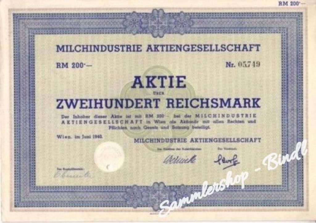 Wertpapier : Aktie über 200 Reichsmark , Ausgestellt in Wien im Juni 1940 , Lochentwertet....Fabriksmäßiger Molkereibetrieb. Spezialprodukte: Trockenmilch, Kondensmilch, Eiskreme, Eislutscher, Milchgelee, Schmelzkäse, Suppenwürze. Gegründet am 21.12.1928 durch Umwandlung der Zweigniederlassung Wien der Milch-Industrie AG Prag in eine selbständige Gesellschaft. Die Gesellschaft besaß Einrichtungen für eine Verarbeitungskapazität von täglich 200.000 Litern. Die tägliche Verarbeitung betrug 1943 ca. 150.000 Liter Milch. Betriebsanlagen (1943): Es wurden 140 eigene Verkaufsstellen und 500 Milchsondergeschäfte in Wien unterhalten. 1960 übernimmt Unilever das Eisgeschäft der MIAG. 1977 wurde die MIAG mit der "Blau-gelb" Warenvertriebsgesellschaft NÖM sowie mit WIMO und der Wiedner Molkerei Johann Trösch fusionier