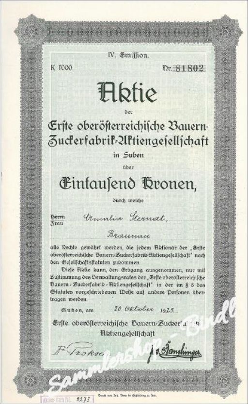Aktie der ersten OÖ. bauern-Zuckerfabrik-Ag in Suben über 1000 Kronenausgestellt auf Sternat Braunau, Suben am 20.10.1923 ,it Unterschrift Prokschund josef ...,35x21 cm mit Kupons,