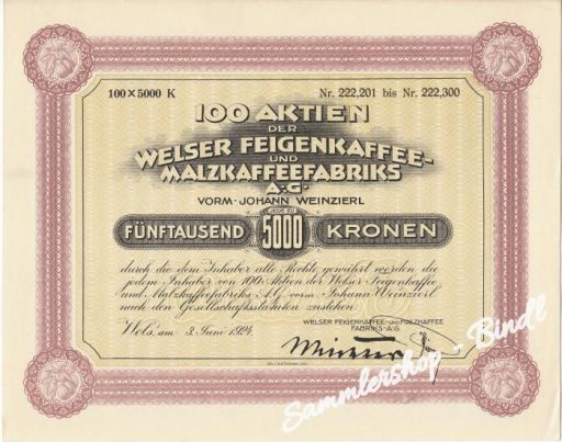 ORGINAL 100 Aktien zu je 5000 Kronen der Welser Feigenkaffee-Malzfabriks AG,vorm Johann Weinzirl! Wels am 3.Juni 1924! mit Orginal Unterschrift! Erh. I