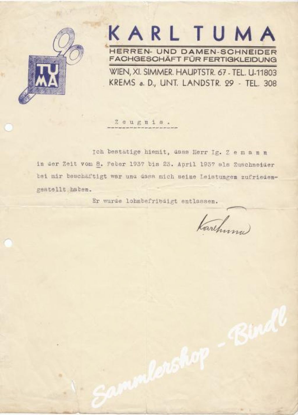Zeugnis 1937 von Karl Tuma Schneidermeister