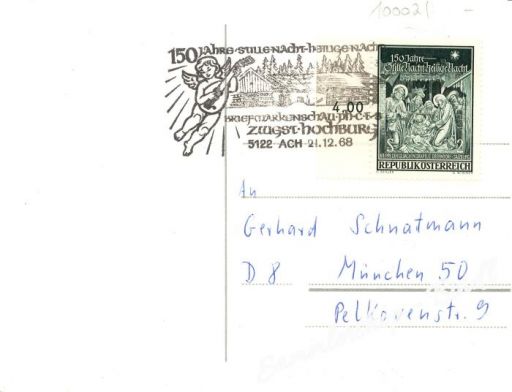 2 schilling frankiert,mit sonderstempel, 150 jahre stille nacht 2.12.1968