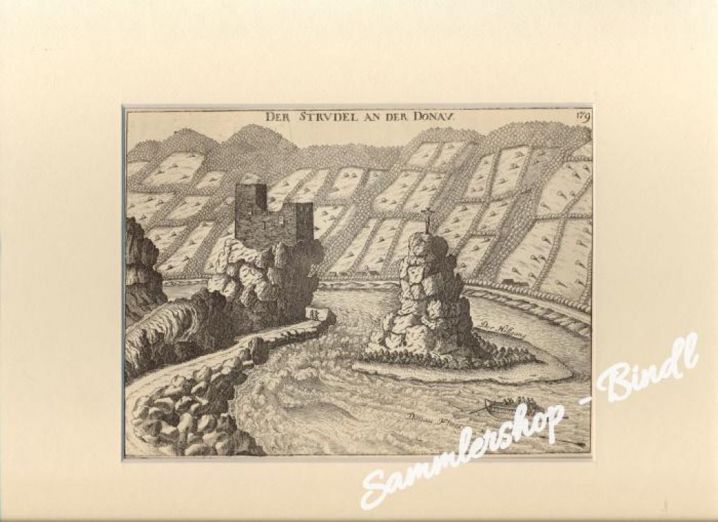 ORIGINAL Kupferstich von Vischer um 1672"Der Strudel an der Donau"bei St. Nikolei,Bild 15x19,5 cm,mit Passepartout 30x24 cm,Ausgabe 1923